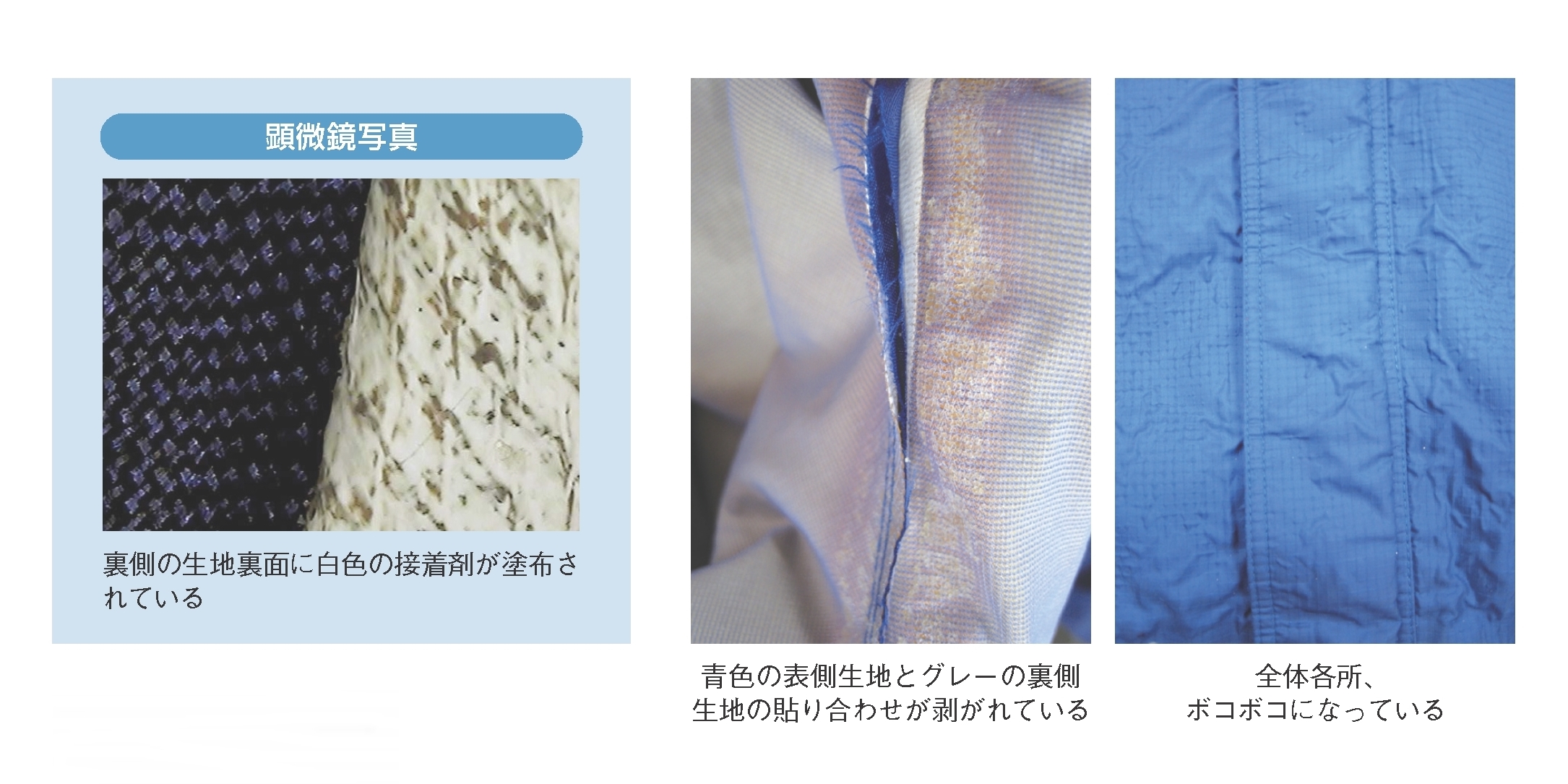 ボンディング加工に使用した接着樹脂が空気中の水分による加水分解などによって経時劣化したところに、クリーニング処理を行ったため、貼り合わせた生地が剥離し、再接着したことで表面がボコボコになったものと考えられる。