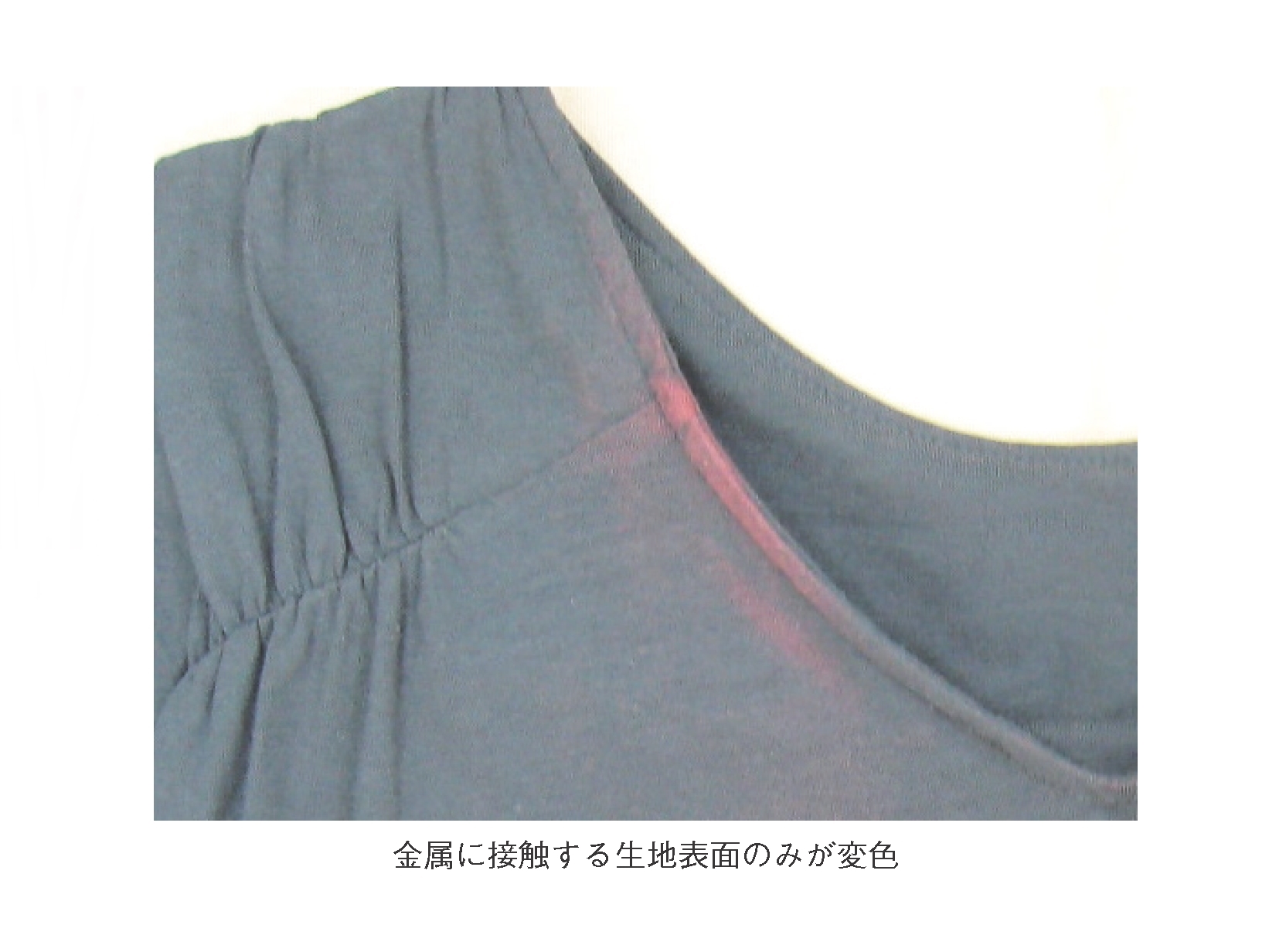 夏物のニットシャツなどに生じる衿や脇下などの変色は、金属の溶け出しが原因になっていることが推測される。
