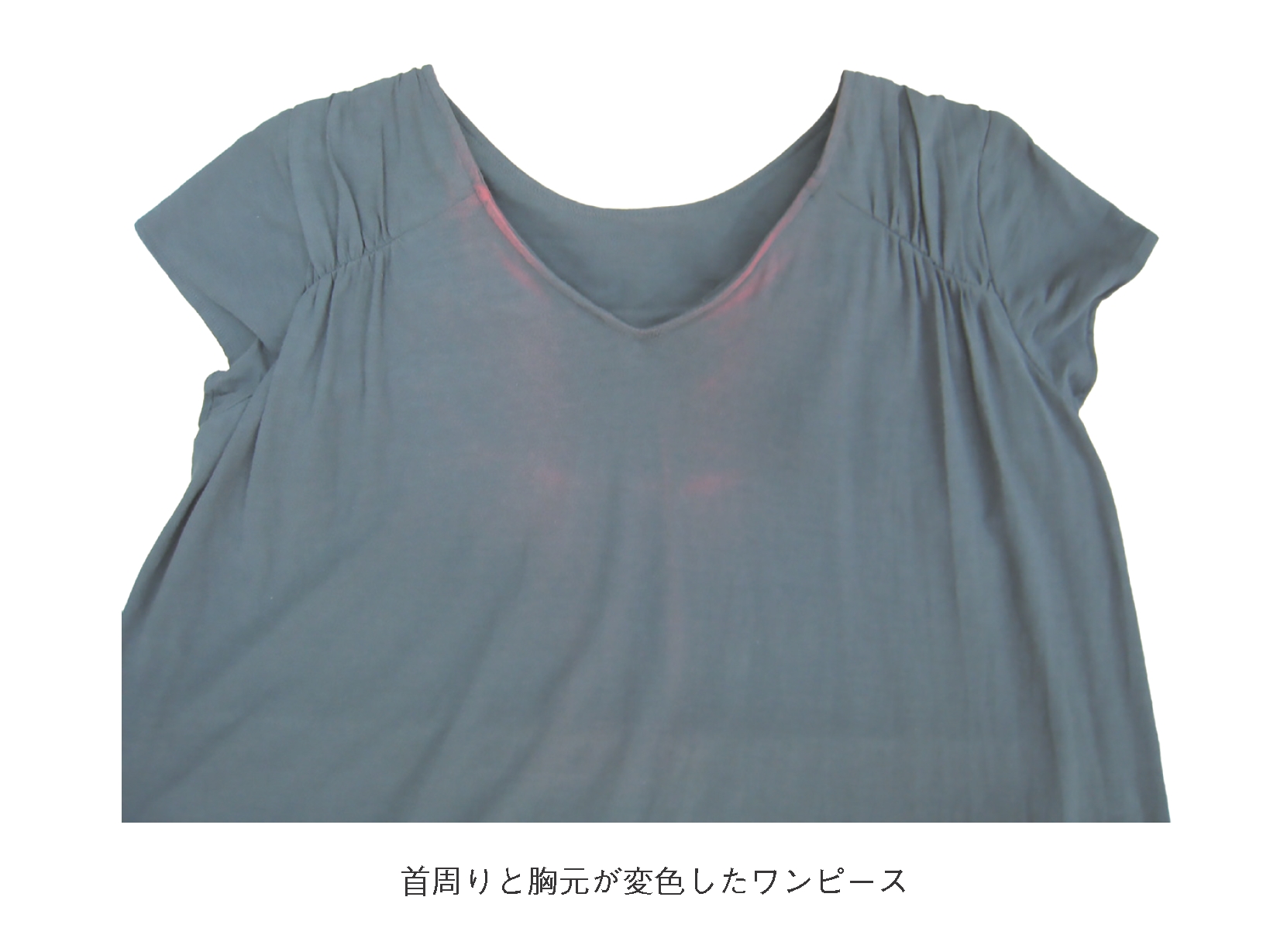 クリーニングから戻ってきたときに異常はなかったが、一度着用したら首回りと胸元が変色したとの申し出があったもの。